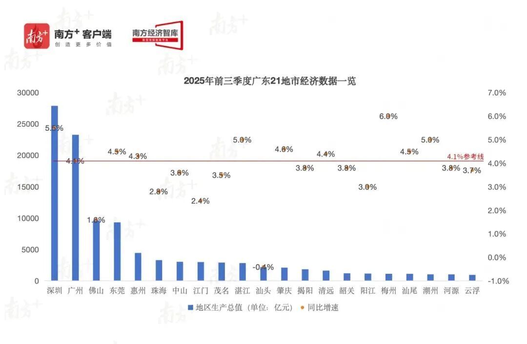 总量方面,深圳(27896.44亿元)、广州(23265.65亿元)、佛山(9620.82亿元)、东莞(9318.93亿元)、惠州(4476.72亿元)继续稳居前五。前三季度,各地市基本稳住了总量基本盘,尤其是几座经济大市、“万亿城市”以自身之稳为全省经济的稳中有进贡献了有力支撑。