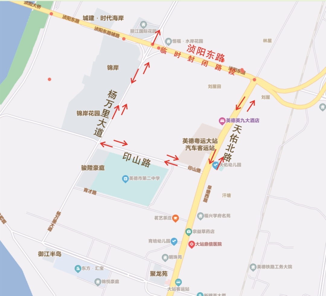过往行人与车辆绕行杨万里大道、印山路、天佑北路(往返)(后附绕行线路图)股涨柜。